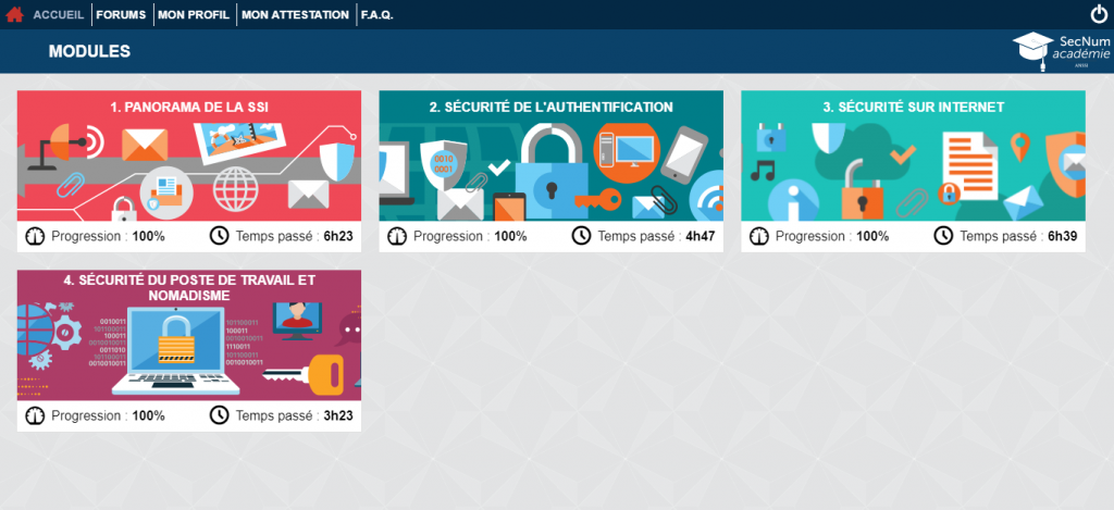 Le MOOC est constitué de 4 modules. Chaque module est accessible de manière illimitée pendant 3 ans, ainsi les modules seront renouvelés en fonction de l’évolution des pratiques et des risques.