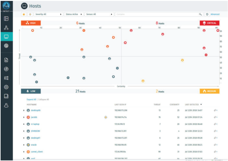 Sur chaque alerte levée, elle positionne deux indicateurs : la menace (Threat) et la certitude (Certainty). La menace indiquera l'impact que cette attaque aura sur l'entreprise tandis que la certitude peut être prise comme un taux de confiance sur le fait que cette alerte soit réelle.