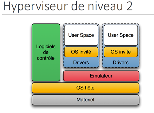 Les hyperviseurs de type 2 ne sont pas des systèmes d’exploitation mais des logiciels, plus précisément des émulateurs. Ces logiciels additionnels à un OS arrivent au 3ème niveau, après le matériel et l’OS.