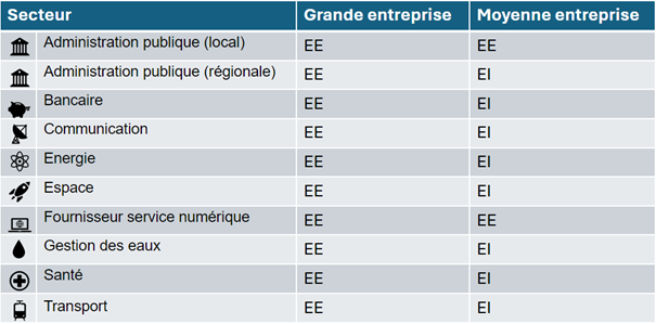 Secteurs d’activité : La directive englobe près de six-cents types d’entités différentes, réparties dans dix-huit secteurs d’activité distincts. Ces secteurs sont stratifiés en deux catégories. En fonction de leur taille ils peuvent être considérées comme des EI ou des EE.