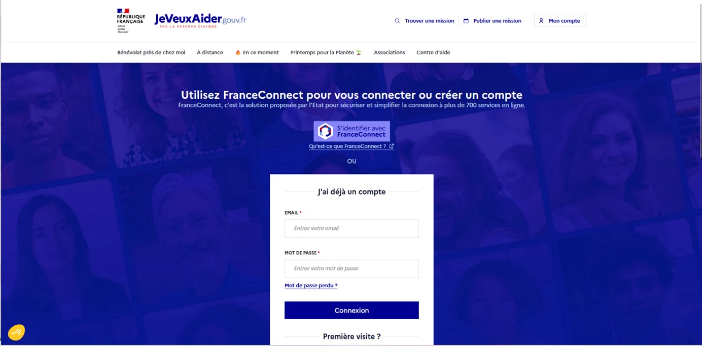 Figure 3 : Exemple où l'on permet à un utilisateur de se connecter à un service (ici jeveuxaider.gouv.fr) soit en utilisant une authentification fédérée (FranceConnect) utilisant le protocole OpenID Connect, soit une authentification locale identifiant + mdp