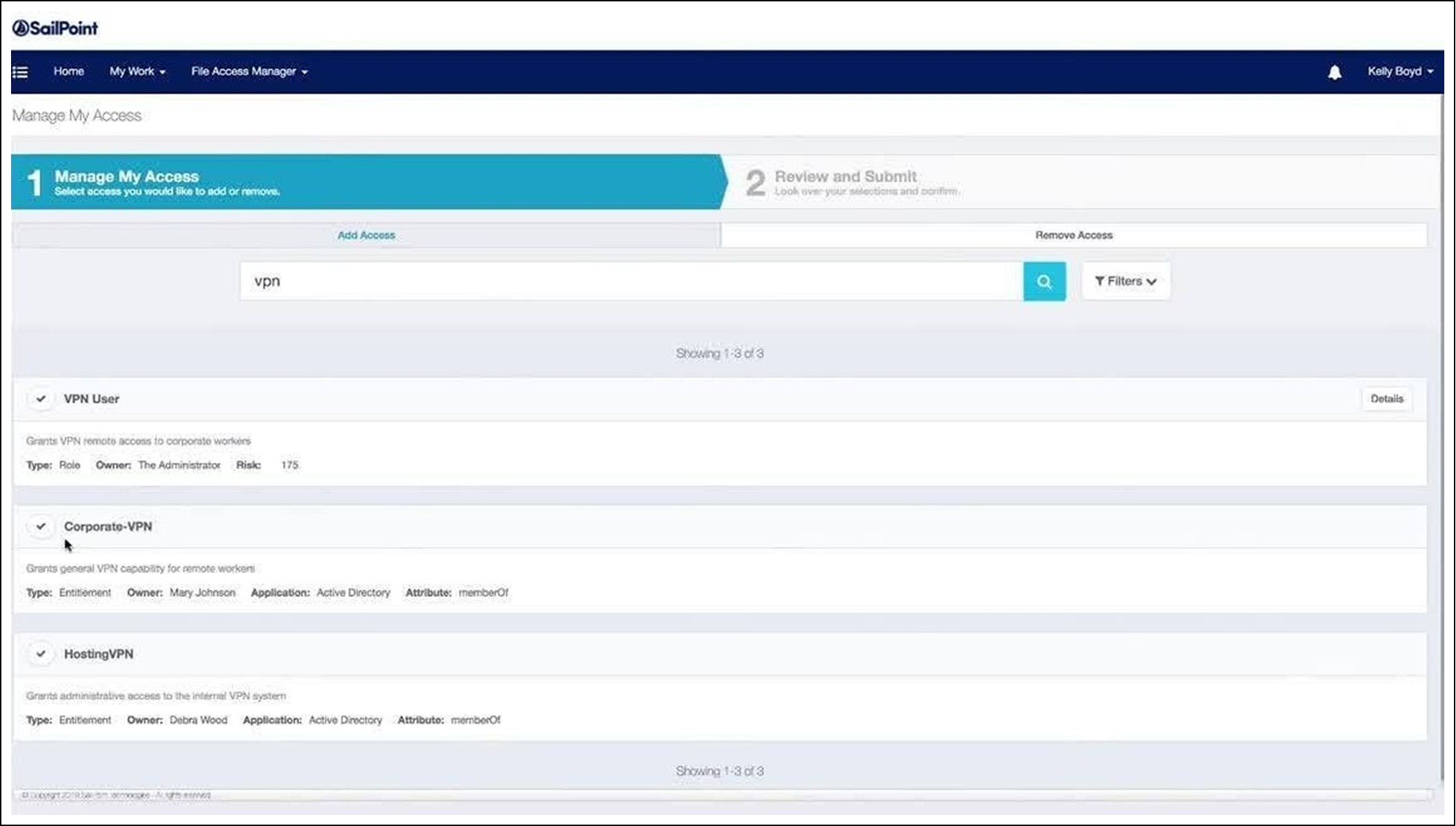 Un formulaire simple de demande d’accès de l’outil IdentityIQ de SailPoint est un bon exemple : on y observelepremierongletd’unedemanded’accèspoursoi-même.Ilyaunongletpourdemanderunajoutd’accèsetun autrepourlesretraitsd’accès.Lesaccèsàl’écransontdeshabilitationsetunrôle.Onvoitdesinformationsles concernant.Le secondonglet estun ongletde revuede lademande pourvérifier qu’elleest correcteavant dela soumettre.