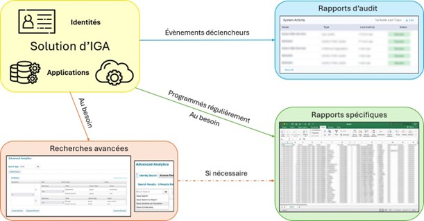 Des outils tels que la génération de rapports, de tableaux de bords et les moteurs de recherches sont disponibles dans les solutions d’IGA pour aider les administrateurs de ces solutions à gérer le SI au mieux.