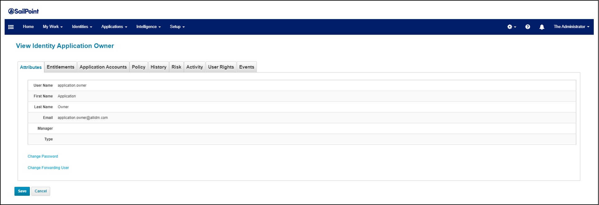 Un cube identité de l’outil IdentityIQ de SailPoint est un bon exemple : on y retrouve bien les informations de l’identité (peu nombreuses dans cet exemple) et on peut voir que des onglets sont disponibles pour visualiser les habilitations (Entitlements), les comptes applicatifs (Application Accounts), les évènements du cycle de vie de cette identité (Events) etc.